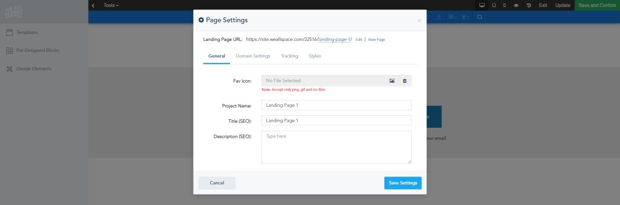 The first step is giving your project a name, for example it could be “My Landing Page”. Then type a title of your page (this is for public view), fill out the meta description for SEO, and upload your own Favicon. Hit Save Settings when you are done. On other settings, you're also able to add custom domain, install Google Analytics or Facebook Pixel script, and set typography styles for your page.