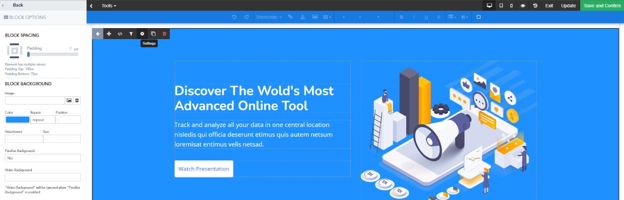 After dragging the blocks to the right, you will see that each block or section has its own control at the top. You can use it for the following things: