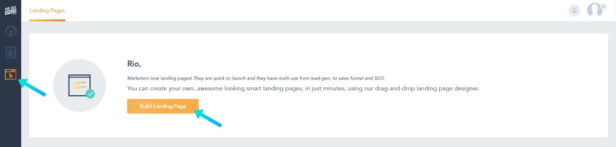To create a one-page website or landing page, click on Landing Pages from the left sidebar and then click on the Build Landing Page or Create a Landing Page button.